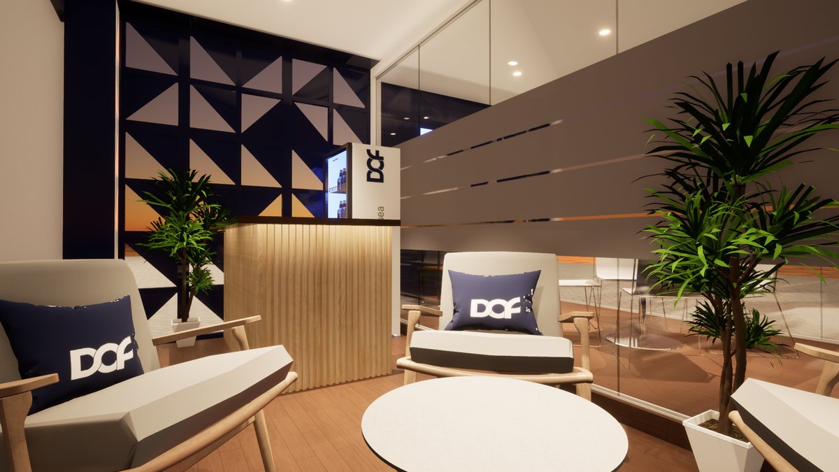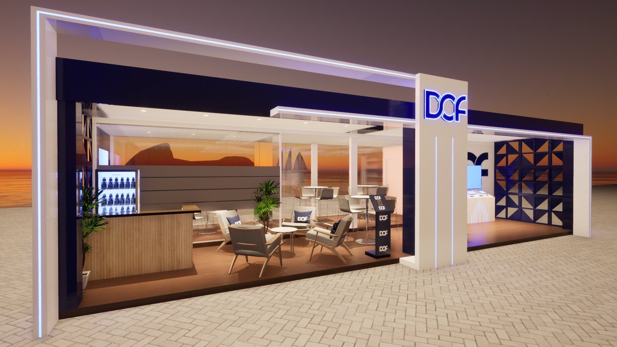 Stand DOF Proposta de cenografia corporativa para o stand da empresa DOF, com conceito alinhado ao KV (Key Visual) da marca, priorizando modernidade, sofisticação e presença institucional. (Parceria com a Cenostart)